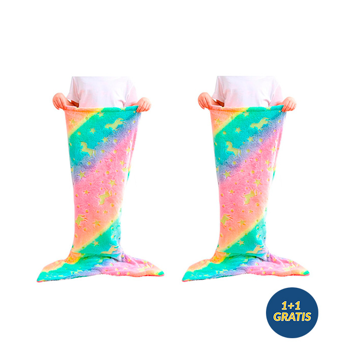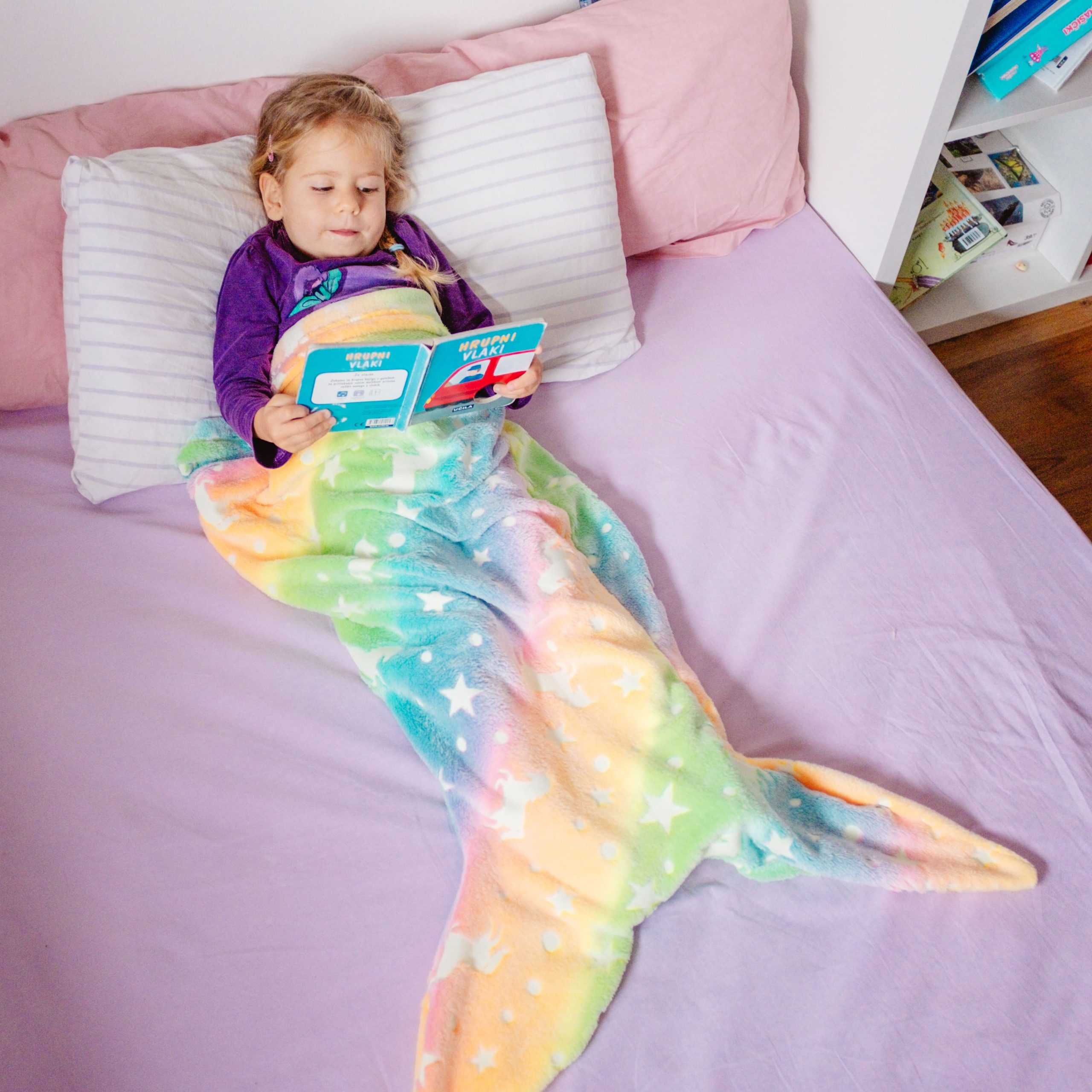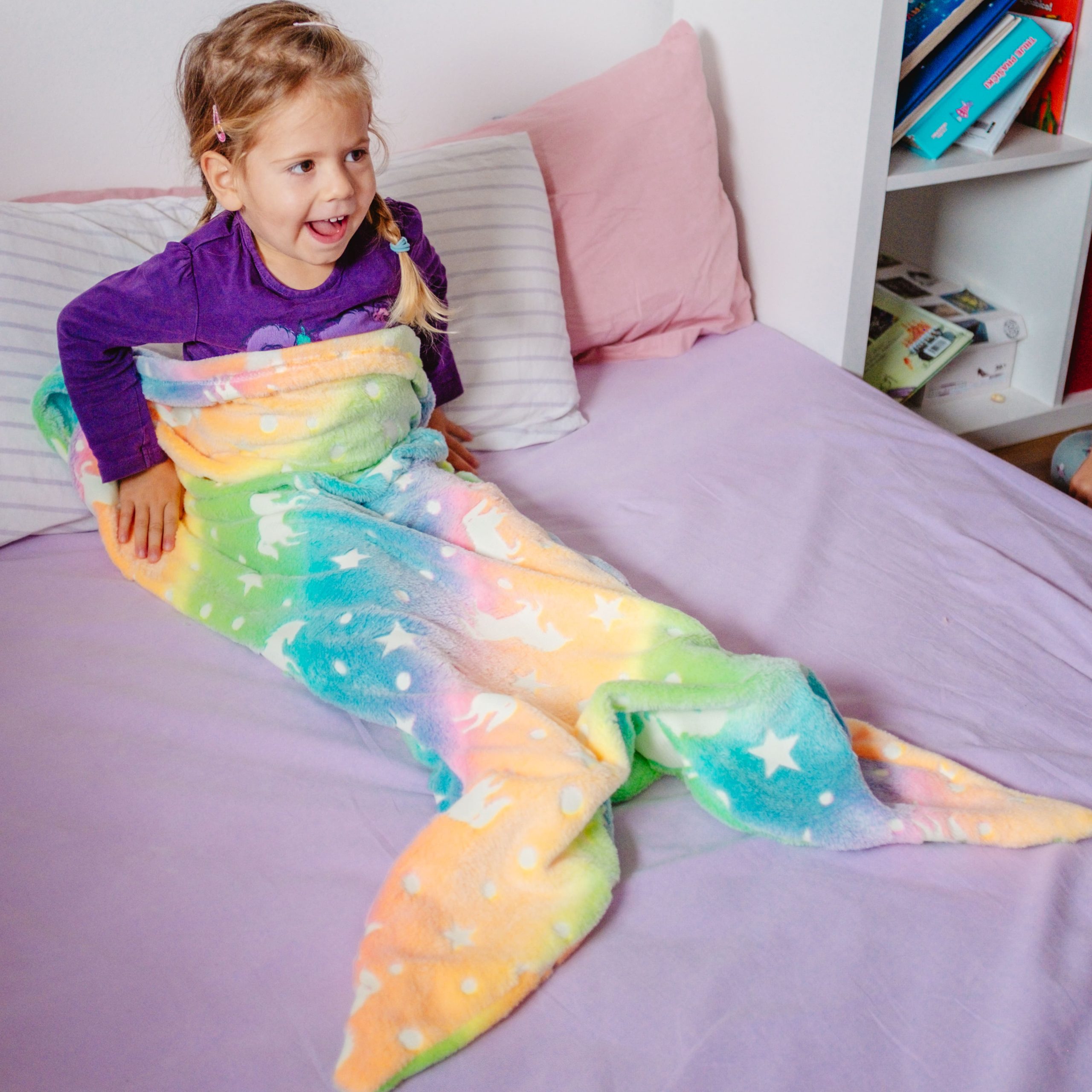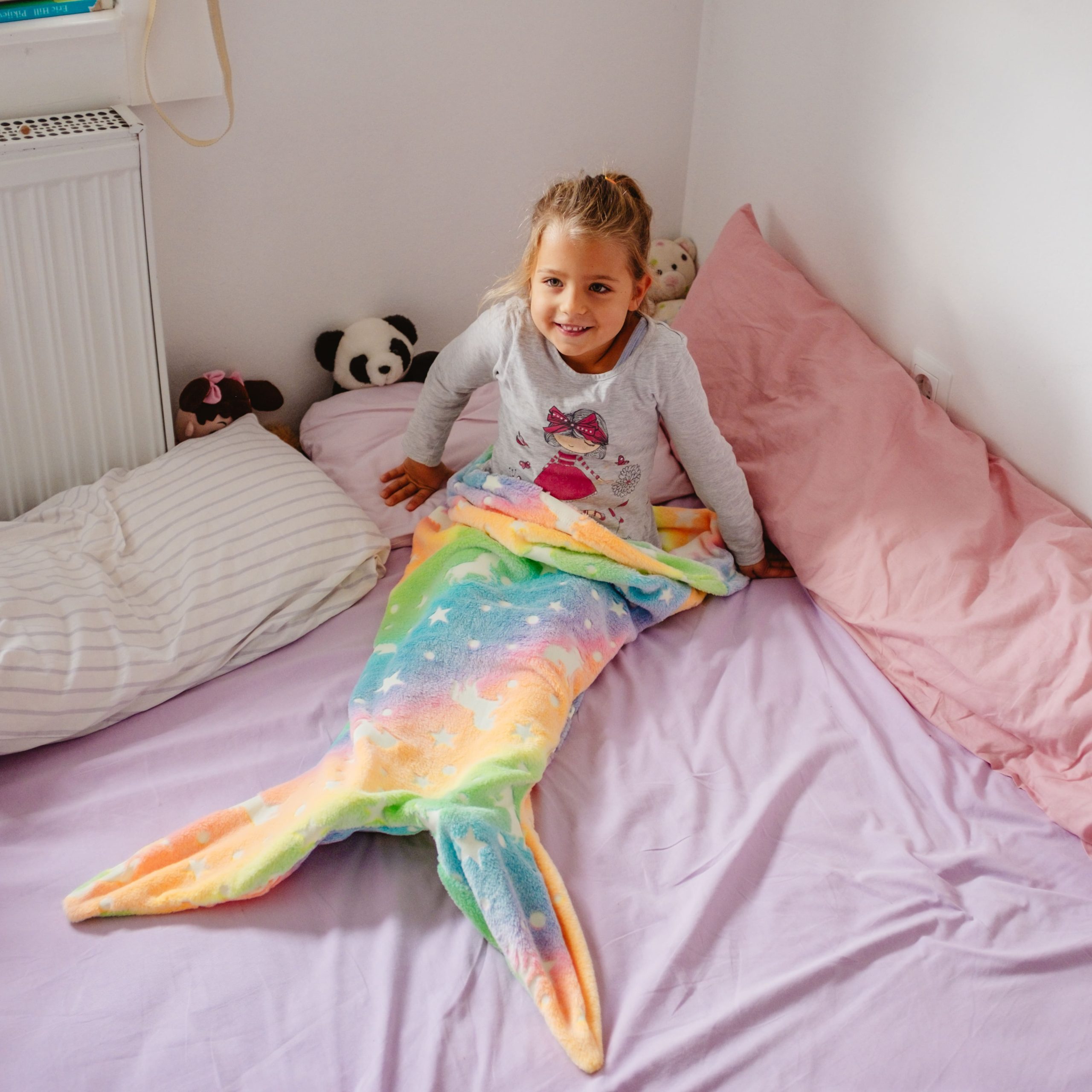 O pătură frumoasă pentru bebeluși în formă de coadă de sirenă care strălucește în întuneric atunci când este expusă la soare!