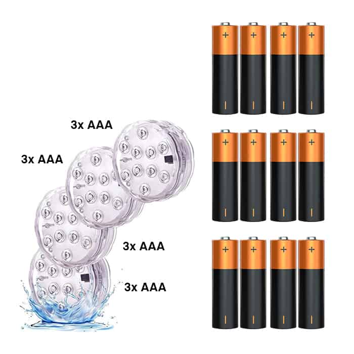 Acest set include 12 baterii AAA pentru cele 4 dispozitive cu LED și 1 baterie CR2025 pentru telecomandă. În acest fel nu va trebui să vă părăsiți casa și veți putea folosi imediat luminile LED GlowWaterLights.