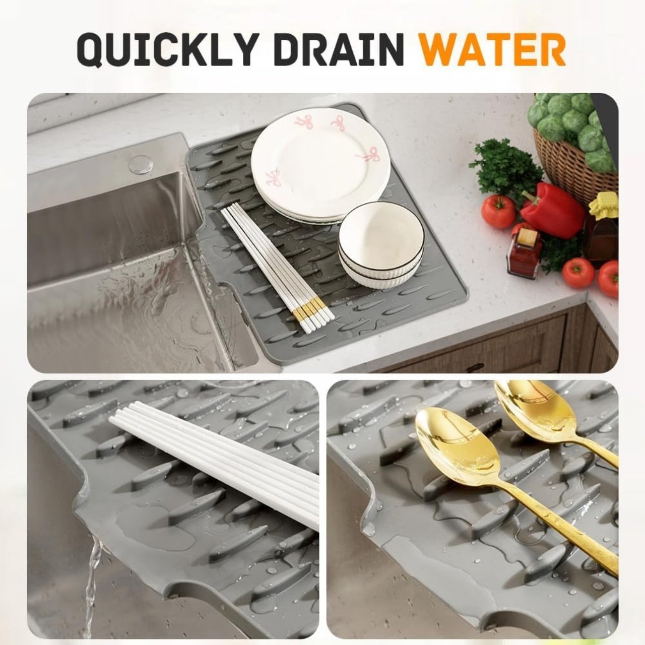 💧 Drenaj rapid – design înclinat 🔥 Rezistent la căldură 🧽 Suprafață antiderapantă pentru stabilitate ✨ Ușor de curățat sub jet de apă 🍴 Potrivit pentru bucătărie și baie