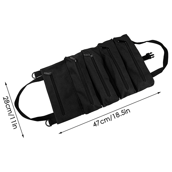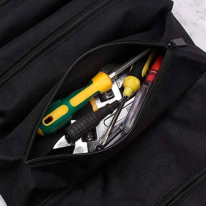Geanta este potrivită pentru depozitarea diverselor unelte și alte accesorii. Poate fi agățată pe perete, în mașină, etc. De asemenea, are catarame pentru închidere.