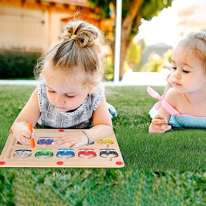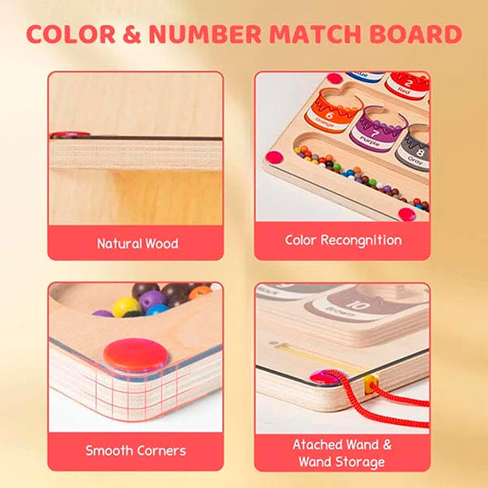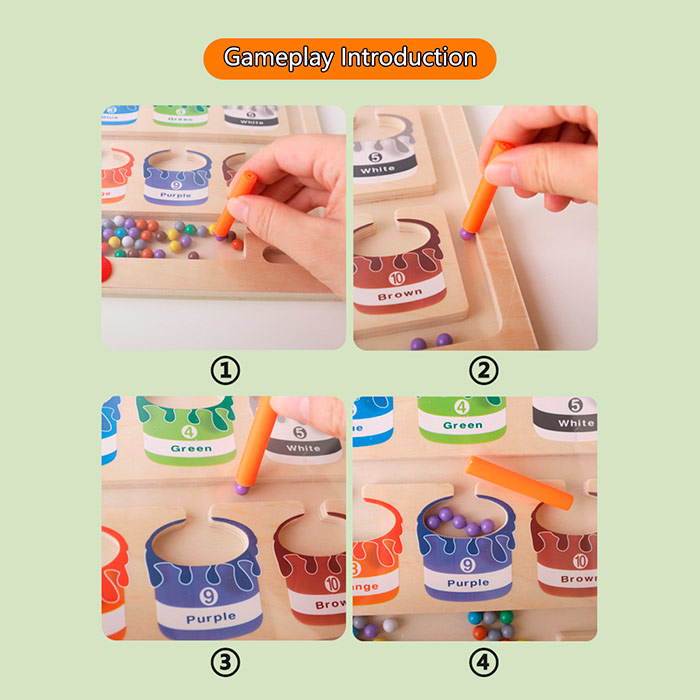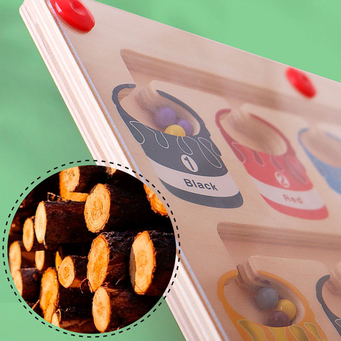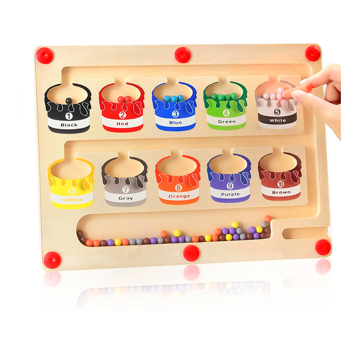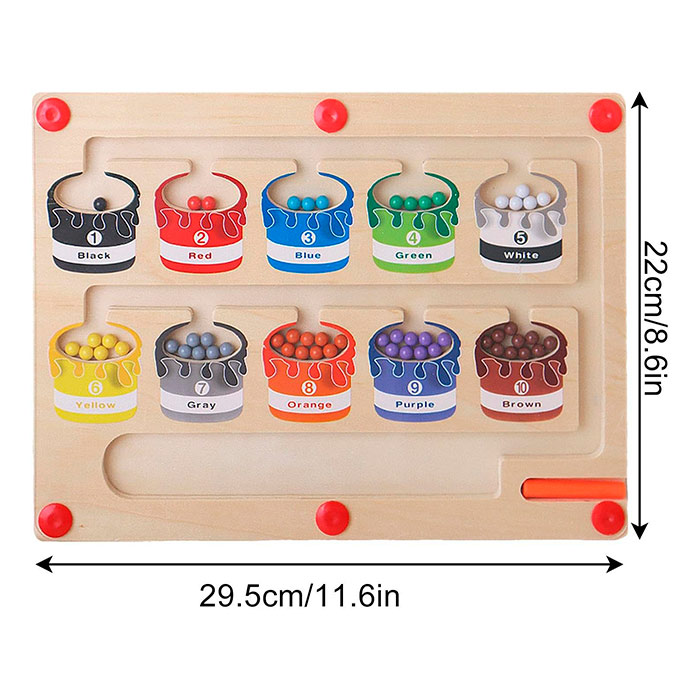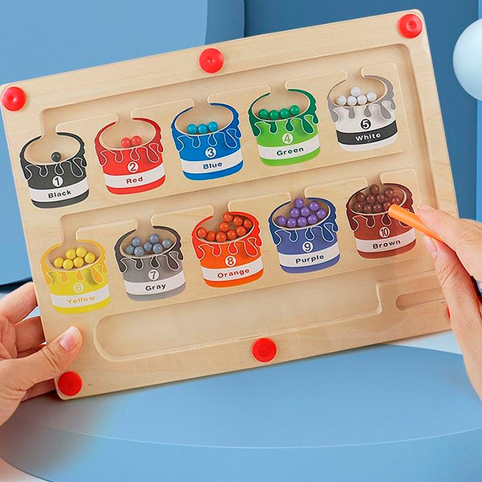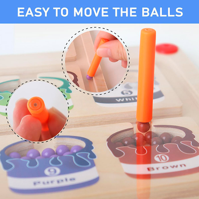 Jucăria educativă magnetică conține o baghetă, cu ajutorul căreia copilul sortează bilele colorate în câmpurile corecte!