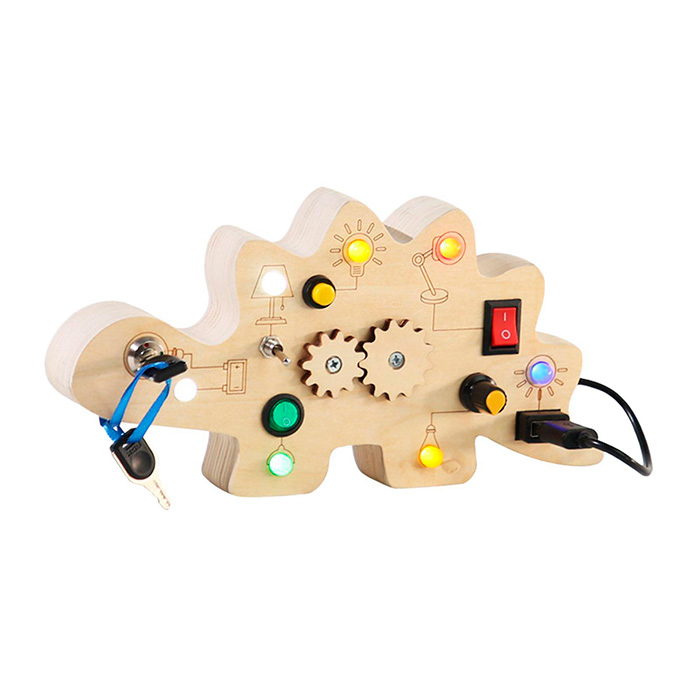 Această jucărie educativă are elemente pentru dezvoltarea motricității fine și diferite tipuri de întrerupătoare, unde copilul învață primele noțiuni de bază despre cum funcționează electricitatea!